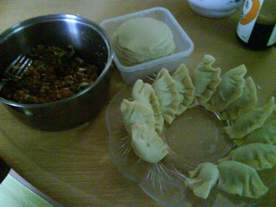 The dough was made from flour. I added hot water little by little into the flour so that it will be completely mixed. Knead it for about 30-40minutes to get it done. I used a glass bottle to make the dumpling skin. This dumpling is made from a mixture of meat, water chestnuts, leeks (all are finely chopped). Easiet way is to use blender to blend meat and water chestnuts so that they are properly minced. For the seasoning, just added soya sauce, salt and sesame oil to taste. Wrapped the mixture and make any designs as you like. Sadly, I only know one design. Hehehehe...